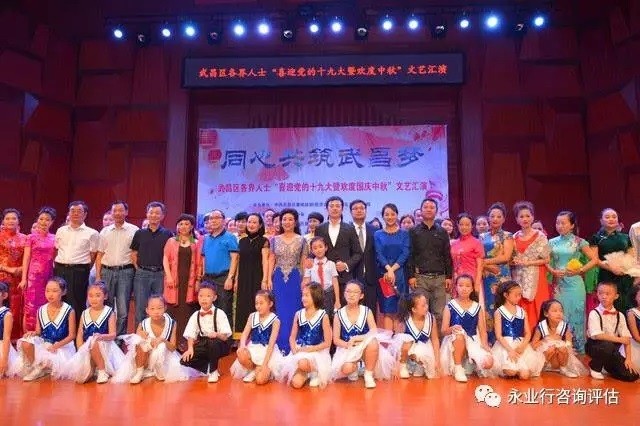 为充分展示武昌区各界人士精神风貌,继承和发扬中国传统文化和优良作风,凝神聚力推动和谐社会全面发展,9月27日上午,武昌区委统战部联合区文体旅广局,在武汉音乐学院民乐编钟厅举办了“同心共筑武昌梦”----各界人士喜迎党的十九大暨欢度国庆中秋文艺汇演。来自区各民主党派、工商联、无党派、宗教界、台联、海联、辛亥后裔、黄埔同学会、侨联、民促会、知联会的代表等400余人欢聚一堂、畅叙友情、喜迎佳节。永业行副总裁王琴应邀参加此次盛会,并带领由公司员工组成的舞蹈团队,将精心编排的舞蹈《Good  Time》呈现于舞台。