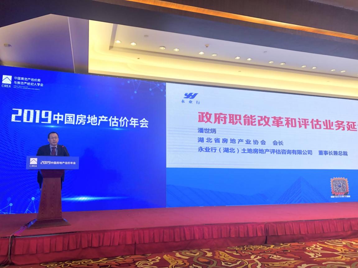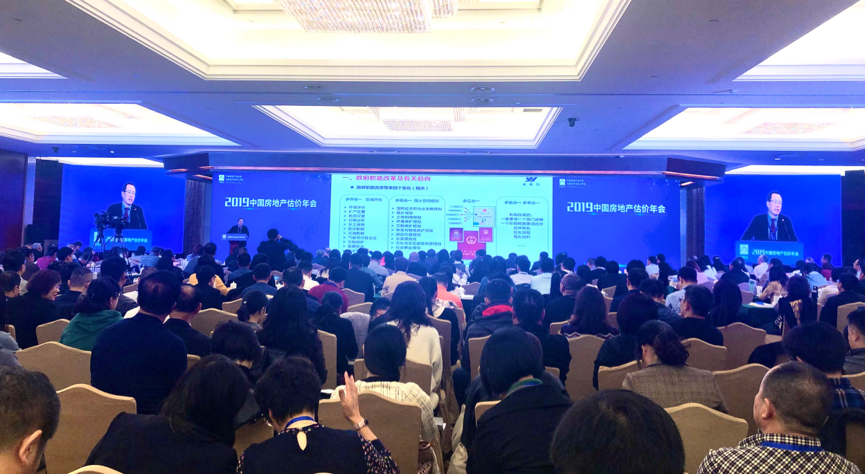 2019年10月24-25日,中国房地产估价年会在京召开,会议由中房学副会长兼秘书长柴强博士主持,中房学会长杜娟、住房与城乡建设部房地产市场监管司副司长王策等领导出席会议,中房学常务理事、永业行董事长兼总裁潘世炳受邀发表《政府职能改革和评估业务延伸》的主题演讲,副总裁雷小军、不动产事业群技术总监郭华参加本次会议。