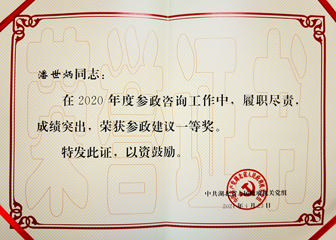近日,中共湖北省人民政府机关党组发文,对2020年度先进参事和参事工作单项奖获奖参事进行通报,省政府参事、永业行董事长潘世炳荣获先进参事、参政建议一等奖、支持参事工作奖等多项荣誉。