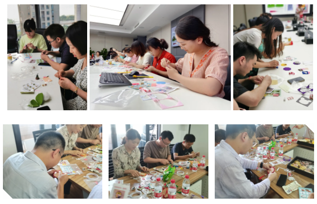 在热烈的讨论中,大家互相指导帮忙,按照步骤有条不紊地进行折布、缝边、填充……随着一双双巧手上下翻舞,一个个精巧别致、趣味十足的香囊呈现在大家手上,细密针脚蕴含着心意,缕缕幽香寄托着祝福。