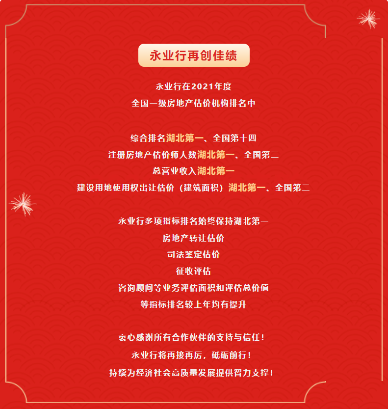 在综合排名中,永业行综合排名湖北第一、全国第十四,估价机构注册房地产估价师人数湖北第一、全国第二,总营业收入湖北第一、全国第三十二,建设用地使用权出让估价(建筑面积)湖北第一、全国第二,房地产转让估价、司法鉴定估价、征收评估、咨询顾问等业务的评估面积和评估总价值等指标排名较上年均有大幅提升。