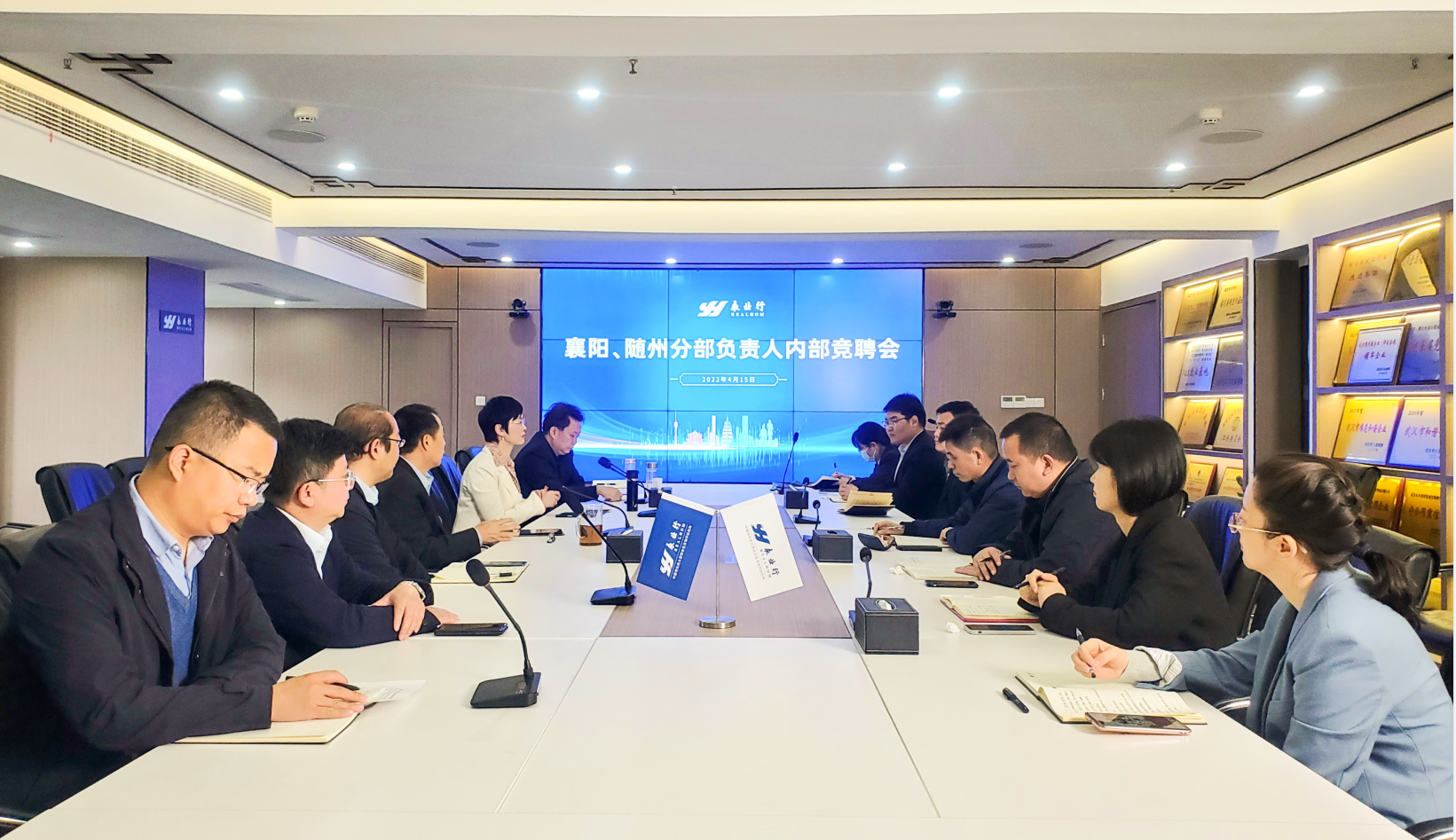 2022年4月15日,永业行襄阳、随州分部负责人岗位竞聘会在总部举办。永业行党委书记、董事长潘世炳,轮值总裁王琴,副总裁吴学锋、雷小军、程为民,相关部门负责人及员工代表担任本次评委,从专业及业务知识水平、工作思路与设想等方面现场对竞聘者进行打分。