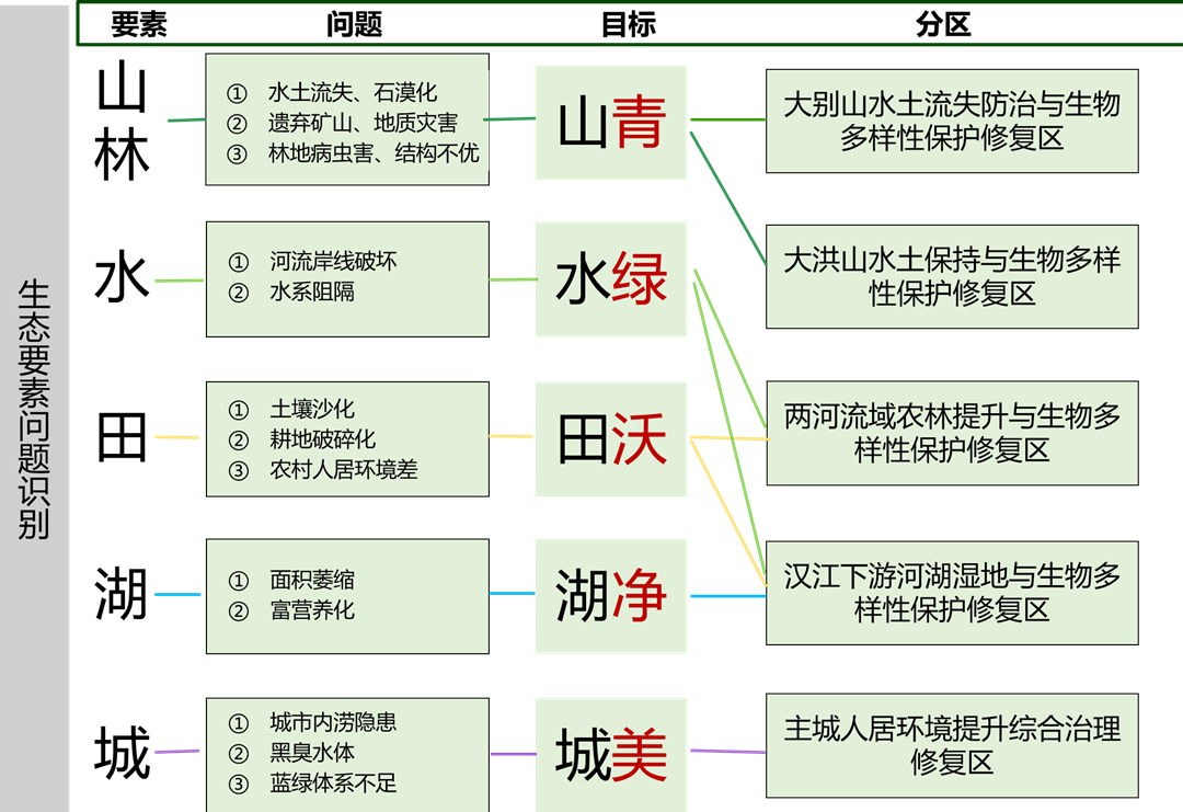 围绕打造“山青、水绿、田沃、湖净、城美”的魅力孝都的总体目标,构建“两屏四廊一园多点”的生态保护修复总体格局。
