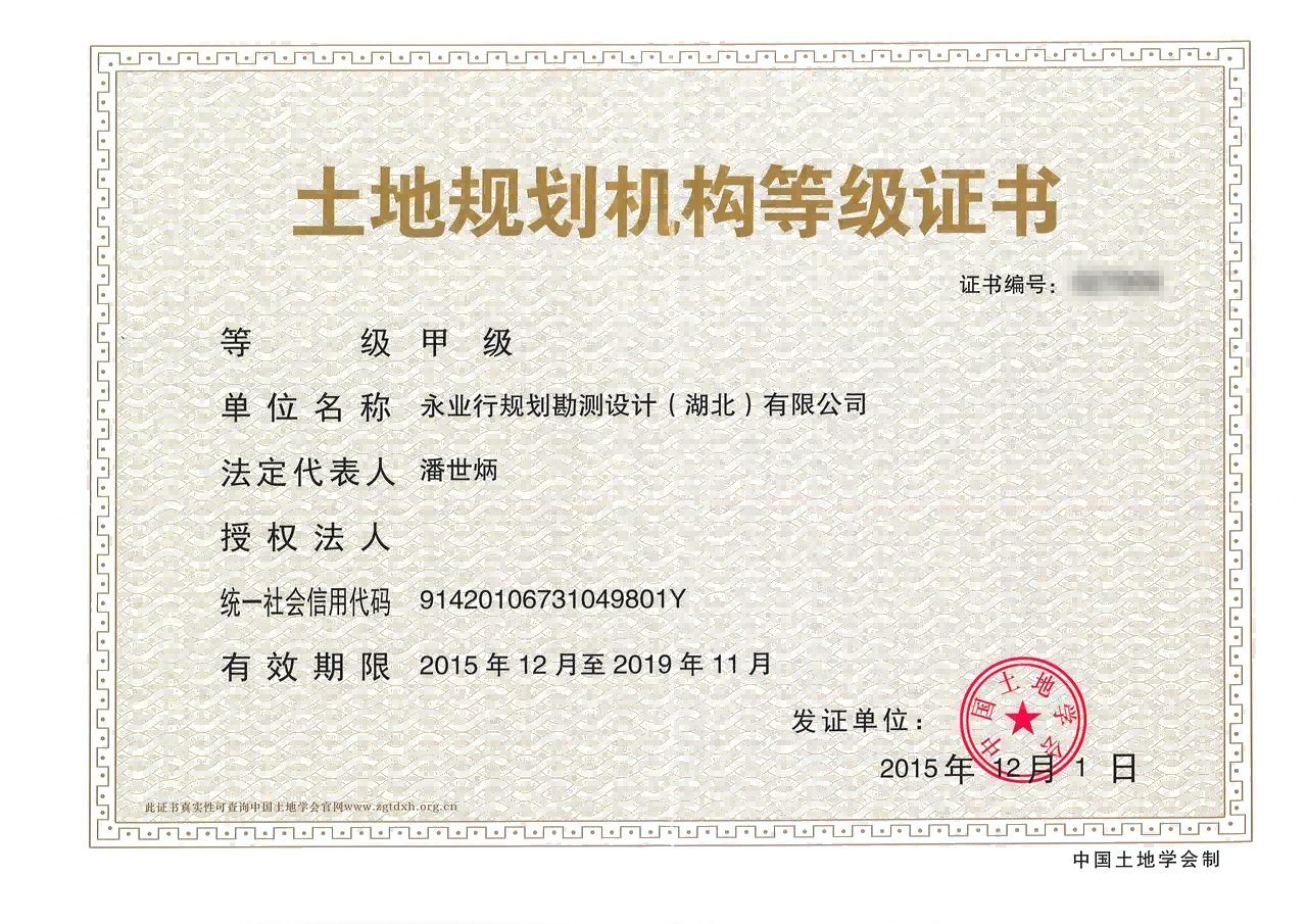 土地规划机构等级证书(甲级)