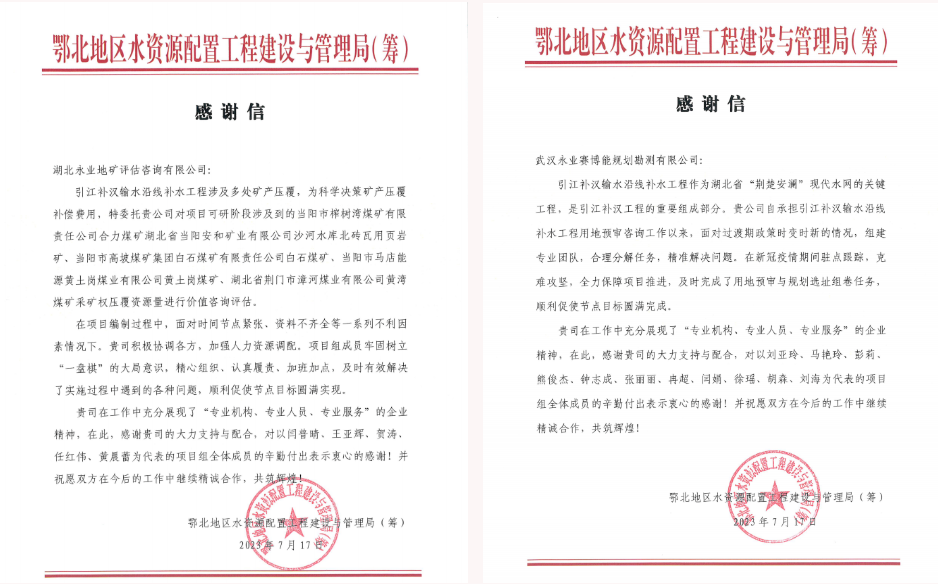 感谢信称,引江补汉输水沿线补水工程作为湖北省“荆楚安澜”现代水网的关键工程,是引江补汉工程的重要组成部分。我公司负责引江补汉输水沿线补水工程用地预审和规划选址工作,并对该工程涉及的多处矿产采矿权压覆资源量进行价值咨询评估。在承担业务过程中,在跨流域多市州协调的背景下,面对过渡期政策时变时新、时间节点紧张、资料不齐全以及疫情等不利因素,项目组成员(刘亚玲、马艳玲、彭莉、熊俊杰、钟志成、张丽丽、冉超、闫娟、徐瑶、胡森、刘海、闫普晴、王亚辉、贺涛、任红伟、黄晨蕾等)展现了高度的专业精神和职业素养,牢固树立“一盘棋”的大局意识,组织安排得力,履责认真,及时有效解决了实施过程中遇到的各种问题,顺利促使各个节点目标圆满实现。