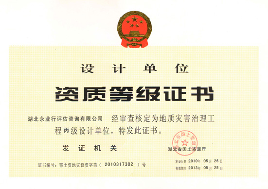 6月11日,永业行取得由湖北省国土资源厅颁发的地质灾害治理工程丙级设计资质,证书编号为鄂土资地灾设资字第(2010317302)号,自此,永业行可以为广大客户提供相关地质灾害治理工程设计业务服务。